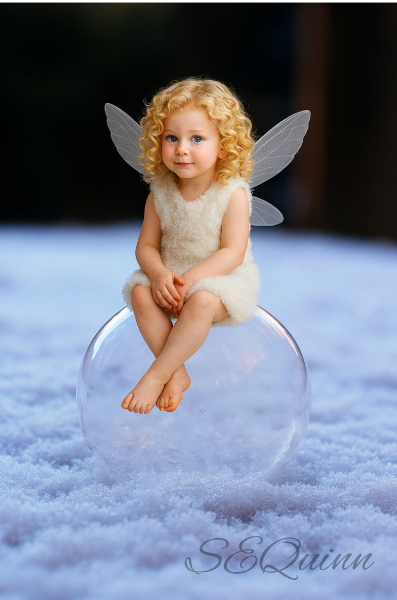 “Cradled on a sphere of wonder, this tiny winged dream floats between snow-light and silence — Baby Bubble Fairy captures innocence wrapped in magic.”
