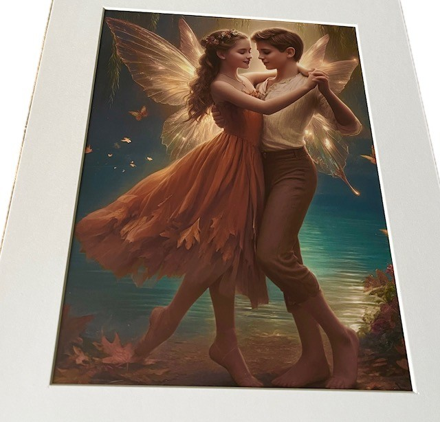 In the quiet glow of the water’s edge, a young boy and girl fairy pause on the brink of their very first dance. Willows sway like gentle chaperones, wings shimmer with new feelings, and the forest holds its breath for their beginning.